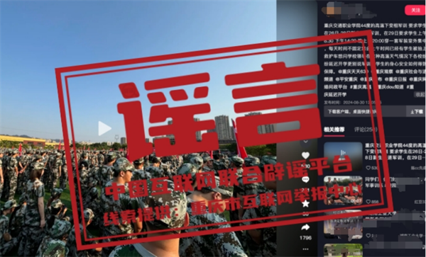 真相:近日,某網(wǎng)民發(fā)布視頻并配文稱“重慶交通職業(yè)學(xué)院要求新生在44度的天氣下進(jìn)行軍訓(xùn),已經(jīng)有學(xué)生暈倒被抬上救護(hù)車”,引發(fā)關(guān)注。經(jīng)向重慶交通職業(yè)學(xué)院核實(shí),近期學(xué)院未安排開(kāi)展任何軍訓(xùn)活動(dòng),更不存在有學(xué)生因?yàn)楦邷靥鞖廛娪?xùn)暈倒的情況。目前,屬地公安部門已對(duì)造謠者展開(kāi)進(jìn)一步調(diào)查。(來(lái)源:“重慶辟謠”微信公眾號(hào))