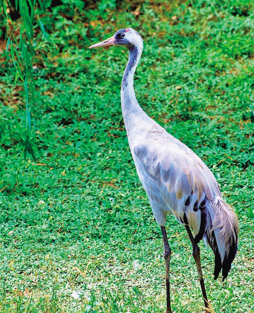 別名千歲鶴、玄鶴、番薯鶴、普通鶴、元鶴。通體羽色幾乎全為灰色;前額和眼先黑色,頭頂裸區(qū)部分呈朱紅色,喉、前頸和后頸灰黑色;自眼后有一道寬的白色條紋伸至頸背;眼虹膜紅褐色或深紅色;嘴暗綠色,先端顏色略淡;脛、跗跖及趾均為灰黑色。(來源:安康市林學(xué)會)t9u安康新聞網(wǎng)