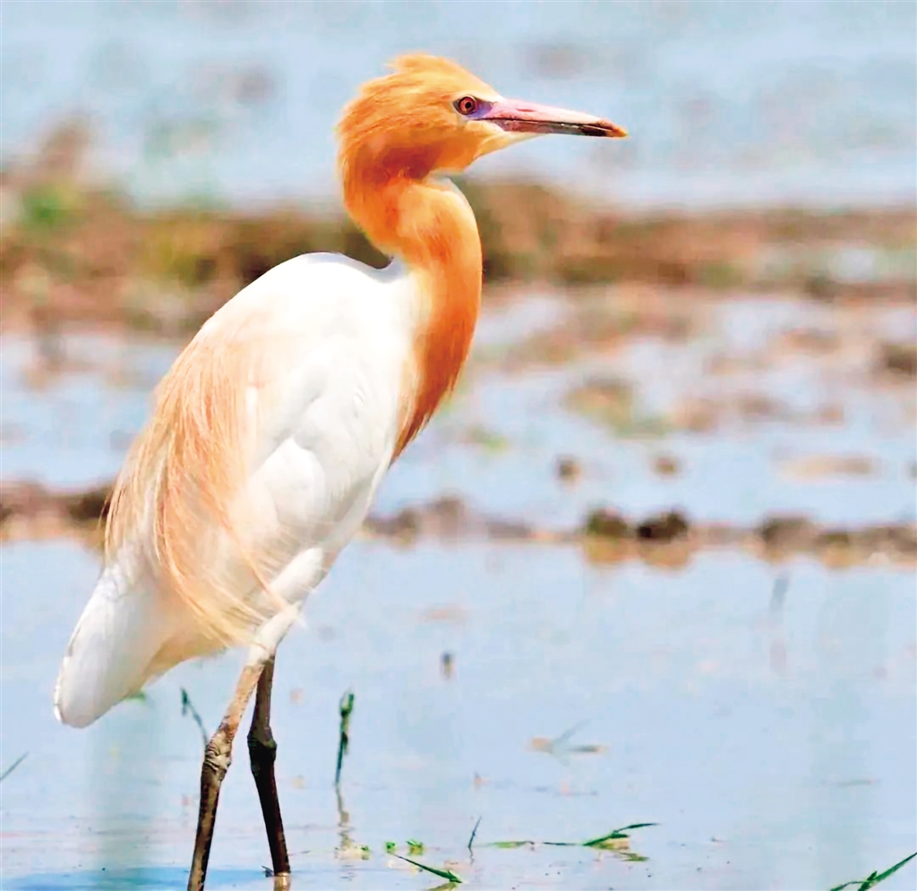 夏羽大都白色;頭和頸橙黃色,前頸基部和背中央具羽枝分散成發(fā)狀的橙黃色長(zhǎng)形飾羽;前頸飾羽長(zhǎng)達(dá)胸部,背部飾羽向后長(zhǎng)達(dá)尾部,尾和其余體羽白色。冬羽通體全白色,個(gè)別頭頂綴有黃色,無(wú)發(fā)絲狀飾羽。橙黃色的喙長(zhǎng)、尖而直,較側(cè)扁、尖端多有小鋸齒;翅較寬長(zhǎng),前頸的基部和背部中央具有羽枝分散成發(fā)狀的橙黃色長(zhǎng)飾羽、前頸的飾羽長(zhǎng)達(dá)胸部,背部的飾羽向后長(zhǎng)達(dá)尾部。牛背鷺喜歡站在牛背上或跟隨在耕田的牛后面啄食翻出來(lái)的昆蟲和牛背上的寄生蟲等,因此得名。(來(lái)源:安康市林學(xué)會(huì))