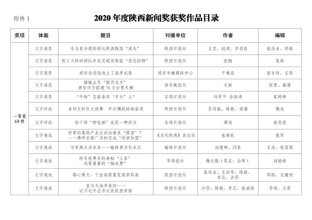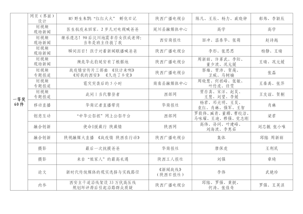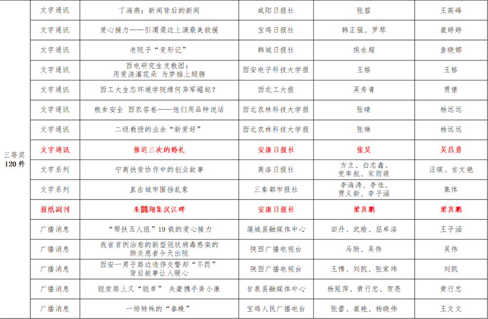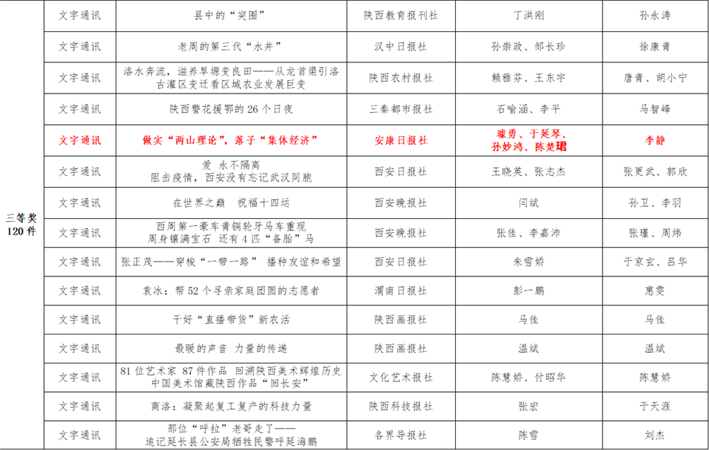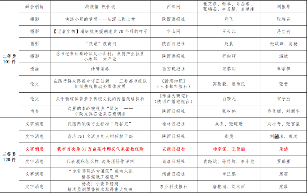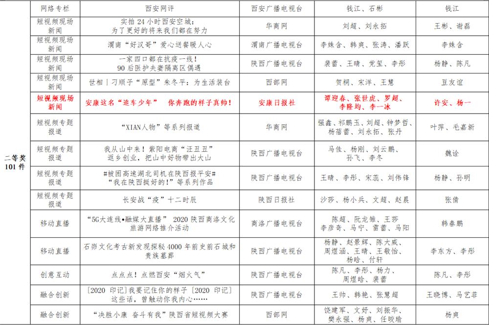7月6日,陜西省新聞工作者協(xié)會(huì)公布了2020年度陜西新聞獎(jiǎng)、陜西省優(yōu)秀新聞工作者評(píng)選結(jié)果,最終評(píng)定2020年度陜西新聞獎(jiǎng)獲獎(jiǎng)作品281件,其中一等獎(jiǎng)作品60件、二等獎(jiǎng)作品101件、三等獎(jiǎng)作品120件;10件作品獲2020年度陜西新聞獎(jiǎng)“中央、省外媒體特別獎(jiǎng)”;12名新聞工作者獲得陜西省優(yōu)秀新聞工作者稱(chēng)號(hào)。Ynz安康新聞網(wǎng)