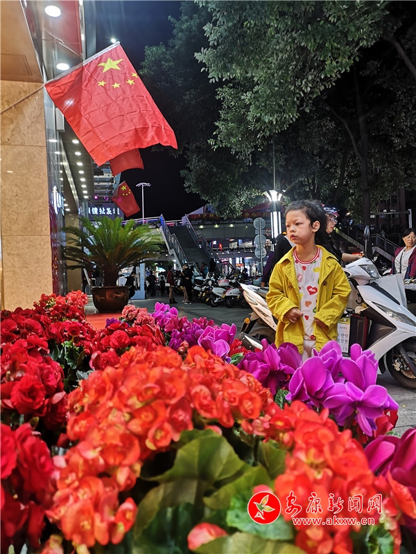 9月30日晚,興安路金州路十字某商家用國慶和鮮花裝飾店面,引得市民駐足。PBy安康新聞網