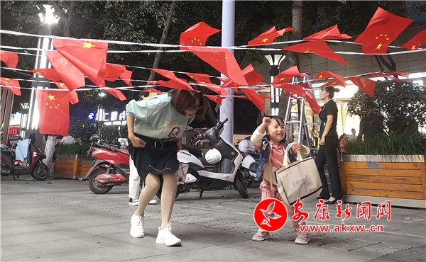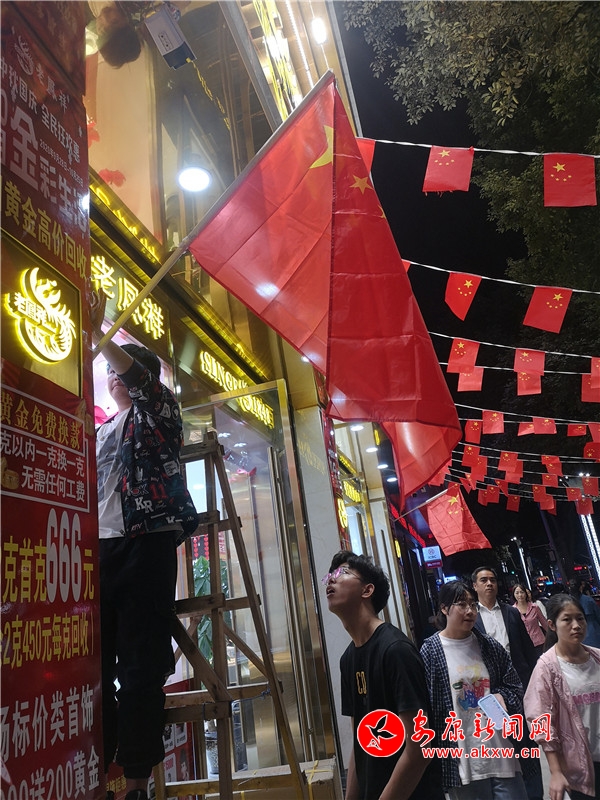 9月30日晚,興安中路某商家正在為店面掛國旗。PBy安康新聞網