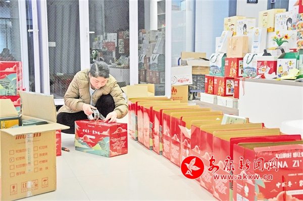 春節(jié)臨近,紫陽(yáng)蒸盆子和年貨大禮包通過電商走進(jìn)了萬(wàn)戶百姓家。目前已銷售紫陽(yáng)蒸盆子4萬(wàn)份,年貨大禮包1000余份。圖為工作人員在打包發(fā)貨。彭召伍 攝