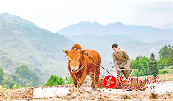 村民趕著牛在稻田里犁地4sF安康新聞網