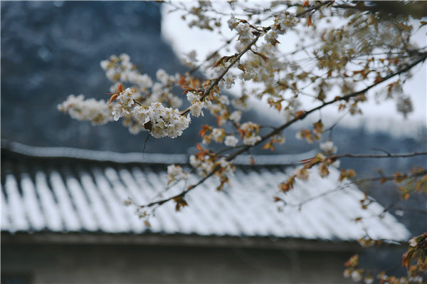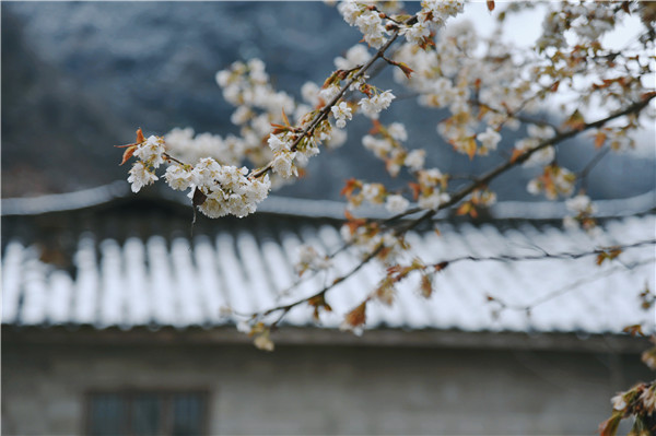 2月25日,石泉縣迎來了新年的第一場雪,高山處的村莊變得銀裝素裹,農(nóng)家小院旁的櫻花開滿枝頭,潔白的櫻花與雪花共舞,為新年增添了更多的樂趣。(儲招賢 攝)6ag安康新聞網(wǎng)