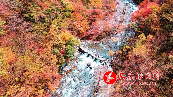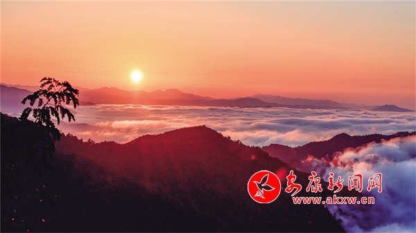 石泉縣城關(guān)鎮(zhèn)楓樹村秋韻正濃,山川色染繽紛,與日出晨霧交相輝映。董長(zhǎng)松 攝