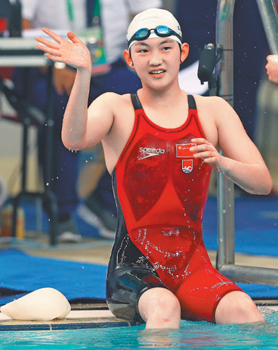 9月3日,李冰潔在獲得女子1500米自由泳冠軍后向觀眾致意。 |