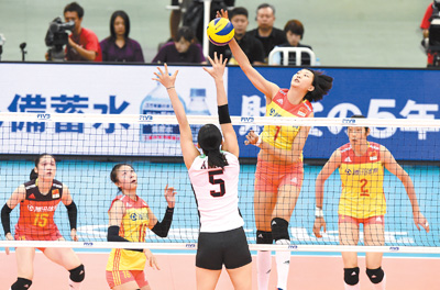 9月10日,在日本名古屋綜合體育館舉行的2017年國際排聯(lián)女排大冠軍杯最后一輪比賽中,中國隊(duì)以3比1戰(zhàn)勝日本隊(duì),從而以五連勝的佳績獲該項(xiàng)賽事冠軍。這是中國隊(duì)時隔16年再度奪得女排大冠軍杯。圖為中國隊(duì)球員袁心玥(上)在比賽中扣球。VJS安康新聞網(wǎng)