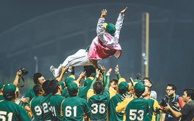 天津棒球隊隊員將教練高高拋起慶祝奪冠。 |