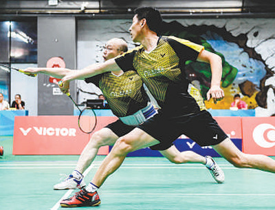 男子C組(50歲以上)雙打決賽北京隊選手母利恩(右)、郭曉宏在比賽中。 |