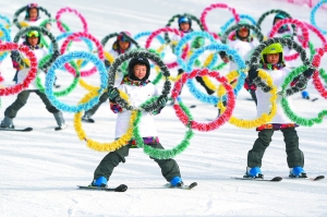 1月21日,“2018世界雪日暨國(guó)際兒童滑雪節(jié)”活動(dòng)拉開帷幕。圖為在北京延慶舉行的開幕活動(dòng)上,幾十位小朋友手持奧運(yùn)五環(huán)標(biāo)志在滑雪教練帶領(lǐng)下滑雪! ⌒氯A社記者 鞠煥宗攝