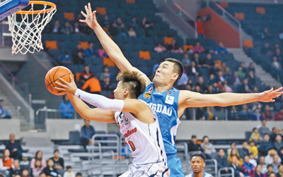 1月23日,青島隊球員蘇偉(后)在比賽中封蓋對手上籃。當(dāng)日,在2017—2018賽季中國男子籃球職業(yè)聯(lián)賽(CBA)第三十輪比賽中,廣東隊主場以119∶104戰(zhàn)勝青島隊。當(dāng)日其他比賽結(jié)果為:新疆125∶108同曦,山東126∶100四川,江蘇110∶92八一,北京108∶92吉林。X7X安康新聞網(wǎng)