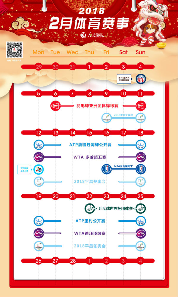 2月恰逢中國新春佳節(jié),在這辭舊迎新的月份中,體壇也大賽不斷。四年一屆的冬奧會,中國冰雪健兒是否會有新的突破,人民體育記者將親赴現(xiàn)場,為您報道;乒乓球世界杯團(tuán)體賽是乒壇開年的首個大賽。2017下半年經(jīng)歷小低谷的中國男乒急需為自己正名,面對擁有波爾、奧恰洛夫的德國隊,以及進(jìn)步明顯的日本隊,他們能否一一擊敗收獲8連冠,我們拭目以待。除此之外,NBA全明星周末對每個籃球迷都是大節(jié)日,看籃球巨星如何玩轉(zhuǎn)比賽;亞冠聯(lián)賽也將在本月開賽,中國球隊的表現(xiàn)令人期待。春節(jié)長假,闔家歡聚,邊看比賽邊過大年,這體驗一定不錯,收藏我們的賽歷,精彩賽事,一覽無遺。