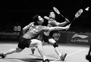 廈門特房隊(duì)劉成、鄭思維(右)在男雙比賽中。 本報(bào)記者 王憲民攝