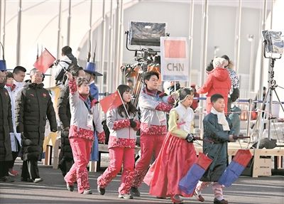 參與今天升旗儀式的中國體育代表團約有80人,在升旗后的表演中可謂是盡顯韓國特色,從冬奧村村長到表演人員都是身著韓國民族傳統(tǒng)服裝,而且很好地將現(xiàn)代與傳統(tǒng)結合起來,尤其特別的是在結束時表演人員盡邀參與升旗儀式的中國體育代表團集體互動,從而使得現(xiàn)場變成一場載歌載舞的歡樂“趴”。