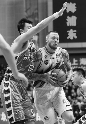 上海嗶哩嗶哩隊(duì)球員明納拉斯(中)在比賽中持球突破。 新華社記者 丁汀攝