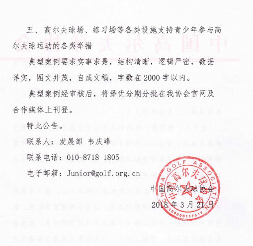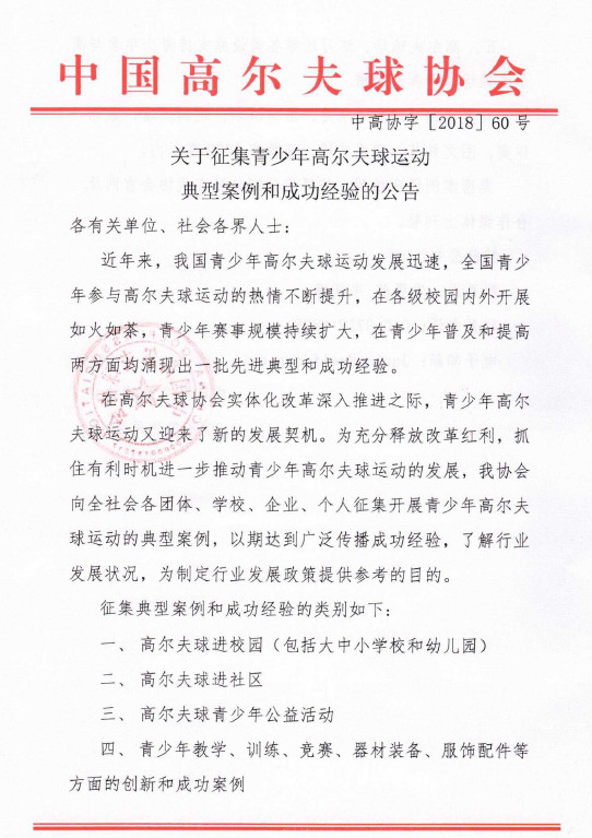 人民網(wǎng)北京3月22日電(楊喬棟)昨天,中國(guó)高爾夫球協(xié)會(huì)發(fā)布《關(guān)于征集青少年高爾夫球運(yùn)動(dòng)典型案例和成功經(jīng)驗(yàn)的公告》(簡(jiǎn)稱(chēng)“公告”)。公告指出,在高爾夫球協(xié)會(huì)實(shí)體化改革深入推進(jìn)之際,青少年高爾夫球運(yùn)動(dòng)又迎來(lái)了新的發(fā)展契機(jī)。為充分釋放改革紅利,抓住有利時(shí)機(jī)進(jìn)一步推動(dòng)青少年高爾夫球運(yùn)動(dòng)的發(fā)展,我協(xié)會(huì)向全社會(huì)各團(tuán)體、學(xué)校、企業(yè)、個(gè)人征集開(kāi)展青少年高爾夫球運(yùn)動(dòng)的典型案例,以期達(dá)到廣泛傳播成功經(jīng)驗(yàn),了解行業(yè)發(fā)展?fàn)顩r,為制定行業(yè)發(fā)展政策提供參考的目的。