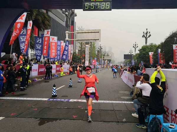 人民網(wǎng)副總裁唐維紅沖過重慶馬拉松終點線