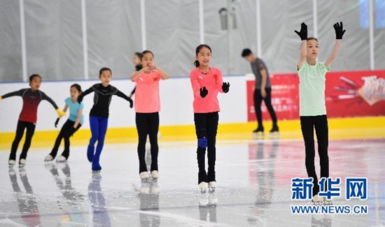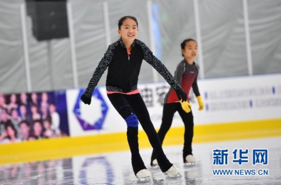 ↑參加海選測試的小運動員們在冰上訓(xùn)練中。新華社記者郭程攝