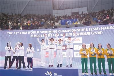 今晚,杭州2018年第14屆FINA世界游泳錦標賽(25米)決出了7個項目的金牌,其中,李冰潔、楊浚瑄、張雨涵、王簡嘉禾組成的中國女隊以7分34秒08的成績打破亞洲紀錄,力壓美國隊和澳大利亞隊奪得了女子4×200米自由泳接力的金牌,這是中國游泳隊在本屆短池世錦賽上的第3枚金牌,也是王簡嘉禾個人第2枚金牌。