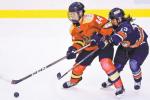 12月10日,深圳昆侖鴻星隊(duì)球員(左)和深圳萬科陽光隊(duì)球員在CWHL(加拿大女子冰球聯(lián)賽)常規(guī)賽比賽中拼搶……