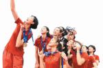圖為中國(guó)女排球員與大冠軍杯獎(jiǎng)杯合影。