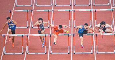 8月28日,中國隊選手謝文駿(左三)在比賽中。 當(dāng)日,在亞運會男子110米欄決賽中,謝文駿以13秒34的成績獲得冠軍!