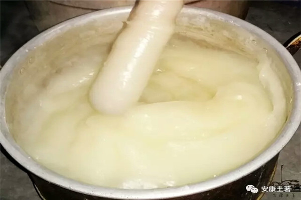 做面魚講究的是熬煮,粉/面下鍋置于煤爐上,用沸水加入不斷攪拌,使粉/面均勻沾水受熱,期間要不停用搟面杖攪拌,要保證粉/面漿煮熟還不粘鍋燒糊,攪拌的力度和方向就全靠多年積累的經(jīng)驗。熬煮成熟的包谷面漿,稀稠得恰當(dāng)好處,過稀掉在鍋里難以成形,過稠壓制過程就格外費勁。反復(fù)加沸水三次并充分?jǐn)嚢鑴騼艉,沸水才能把?面煮熟。