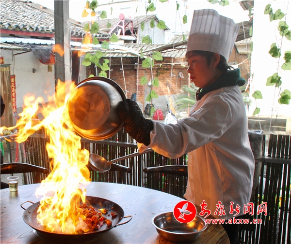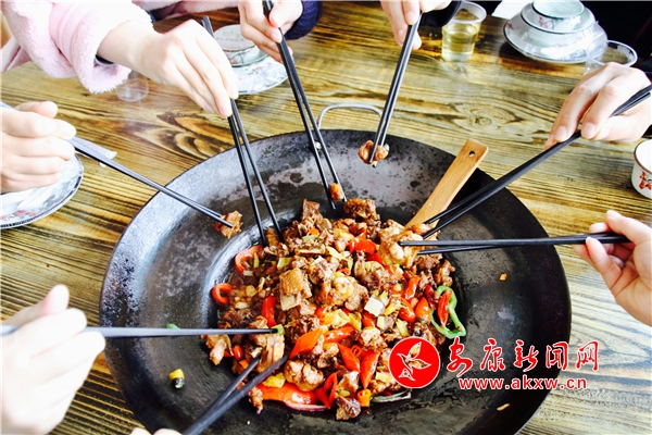 許苗苗是“好友之家”的三個合伙人之一,是個快人快語的女老板,她麻利地穿上白色大廚褂子,拿著一個從貴州定制的鐵鍋在手中掂了掂,迅速放在桌子上放油加熱,將預(yù)先準(zhǔn)備好的紅綠尖椒倒入鍋中翻炒,隨后將腌制好的雞塊伴著酒倒入鍋中,霎時間火苗竄出半米高,圍觀的客人們發(fā)出陣陣感嘆。等上幾秒火小了,許老板不慌不忙地用鏟子翻炒大致兩分鐘,香味撲鼻的鐵鍋雞便做好了。許苗苗介紹道:“貴州鐵鍋雞一雞三吃,將一只整雞剔骨,骨頭用來熬粥,帶少許骨頭的雞肉入鐵鍋進行第一道加工食用,吃到一半的時候放入無骨雞肉上鍋燜煮十來分鐘,這樣才能將雞肉帶來的所有味覺體驗發(fā)揮到淋漓盡致。”
