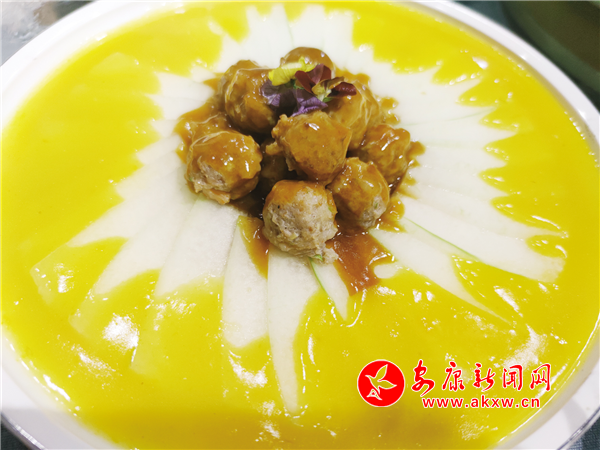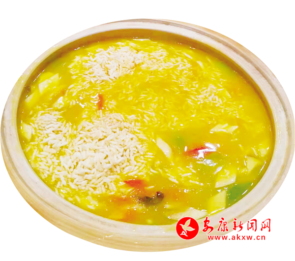 這是一道舌尖美味,制作時提前把海參、青筍、杏鮑菇、紅蘿卜切好汆水,備好墨魚花、蝦仁、棒骨高湯、南瓜泥、咸蛋黃,炸好香米,客人餐前,把炸好的香米復炸香脆裝盤,再把雞油、咸蛋黃、高湯和南瓜泥放入鍋內翻炒,然后倒入海參、青筍、杏鮑菇、紅蘿卜、墨魚花、蝦仁等食材,燒開勾芡,調制成濃香金湯,起鍋裝盆,端到客人餐桌,當著食客的面將脆米倒入盛裝金湯的土盆里,攪拌均勻即可。這道菜看著五顏六色、金黃油亮,吃著養(yǎng)胃養(yǎng)顏,湯汁鮮美,營養(yǎng)豐富。