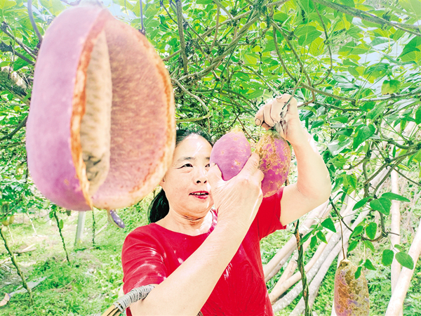 遠(yuǎn)嫁安徽的漢濱區(qū)雙龍鎮(zhèn)謝坪村魏澤會(huì),在外打拼一生,年逾花甲思鄉(xiāng)心切,于2018年回到家鄉(xiāng),在老家附近的一條山溝里,栽種了30畝八月炸。今年,八月炸喜獲豐收。走進(jìn)園區(qū),一行行、一架架八月炸藤蔓,掛滿了粉紅的果實(shí),有的裂開(kāi)果肉,像極了開(kāi)懷大笑的娃娃。魏澤會(huì)說(shuō):“今年產(chǎn)量達(dá)到3萬(wàn)公斤左右,因八月炸不易保存,謝坪村第一書(shū)記汪道軒和陜西省生態(tài)廳環(huán)境信息中心駐村干部馬祥一起,先后通過(guò)網(wǎng)絡(luò)推介、電商促銷和臨時(shí)售賣點(diǎn)等幫我們銷售。”為了最大限度增收,魏澤會(huì)已嘗試?yán)冒嗽抡ㄡ劸、榨油等,均已成功,因產(chǎn)量很小,暫未對(duì)外銷售。