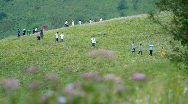 7月21日,游客在神田草原上游玩。在陜西嵐皋縣與重慶城口縣交界處的大巴山主脊上,坐落著一片高山草甸——神田草原。入夏,這里碧草千頃,野花漫山,……