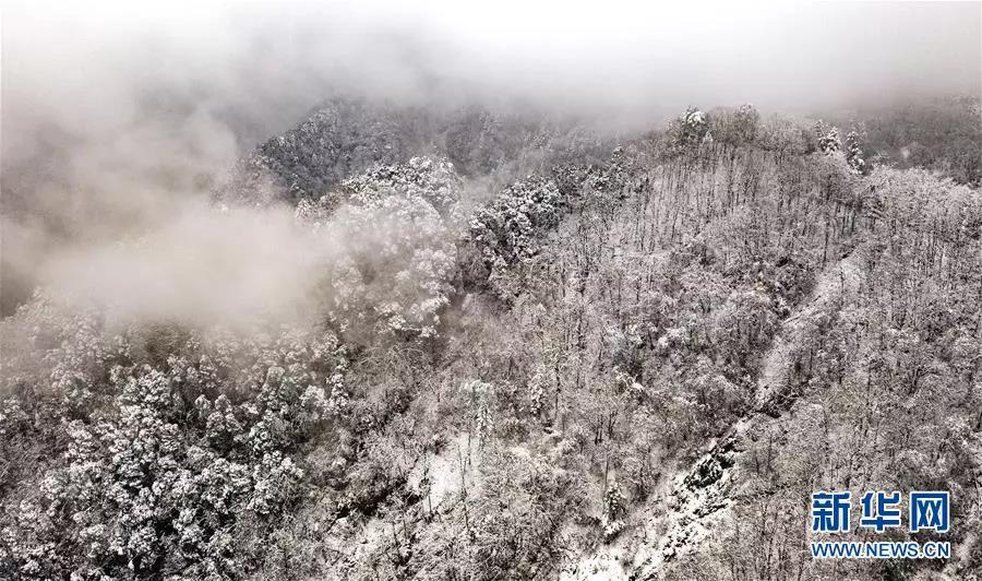 11月8日無人機(jī)拍攝的銀裝素裹的鬼谷嶺國(guó)家森林公園主峰。 新華社記者陶明攝