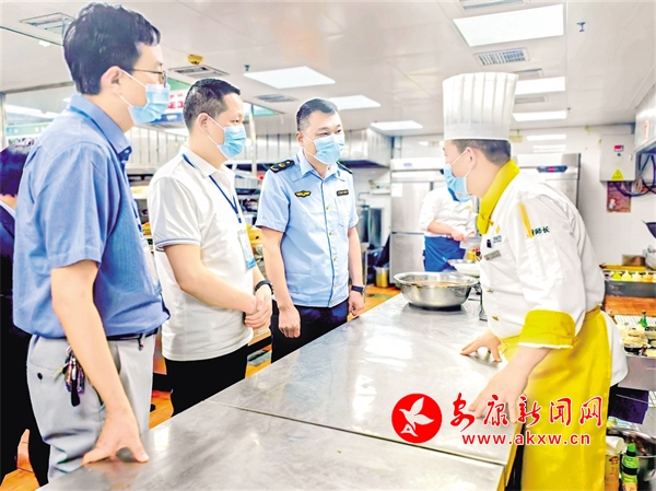 “五一”假日將至,漢濱區(qū)紀委監(jiān)委會同市場監(jiān)督管理部門對中心城區(qū)酒店餐飲服務(wù)場所開展監(jiān)督檢查。圖為檢查組在某酒店后廚了解情況。鄭時根 攝