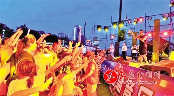 夜幕降臨,酷炫的舞臺霓虹閃耀、彩燈環(huán)繞、亮如白晝,音樂節(jié)在一曲《別非要我大聲說出來》中拉開帷幕,可容納千人的親水廣場人聲鼎沸、接踵摩肩,往來嬉戲游玩、親水樂水、觀看表演的群眾絡繹不絕。樂隊貝斯手、吉他手撥動琴弦,現(xiàn)場觀眾紛紛揮舞著手中的熒光棒,跟隨音樂盡情搖擺、合唱,隨著《稻香》《簡單愛》《夢醒時分》等一首首經(jīng)典歌曲的演唱,現(xiàn)場氣氛熱烈、高潮迭起。