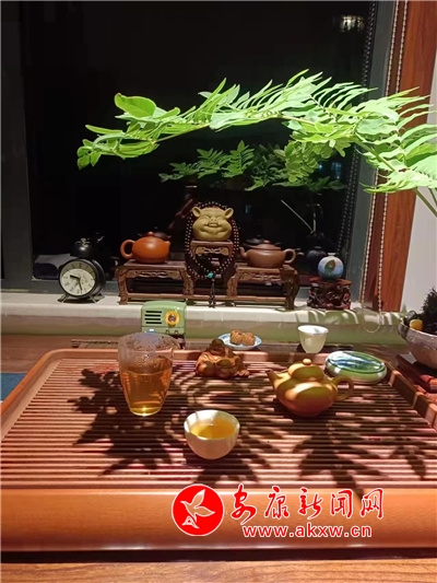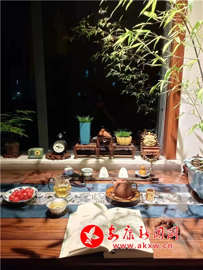 次日,我便聯(lián)系他,欲欣賞一下他的書房陳設(shè),他欣然允之,發(fā)了書房的照片。但見潔凈的白色窗臺(tái)上擺放著清秀的文竹、蔥綠的石菖蒲、一尊笑容可掬的彌勒佛、精巧小豬擺件上系著一串佛珠,雞翅木書桌上擺放著古樸典雅的茶具旁擺置一株紫竹。彼時(shí),許是他正品著香茗,展卷而讀,然后進(jìn)入一個(gè)縱橫千萬(wàn)里,上下幾千年的世界。徐徐夏風(fēng),紫竹搖曳,竹影映射于書,似也愜意。