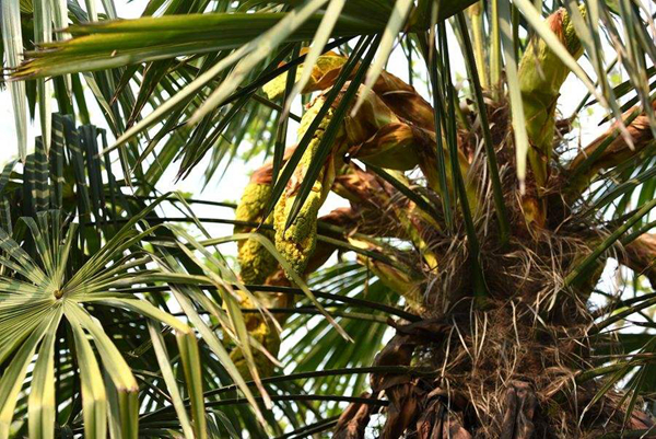 到了80年代初,當(dāng)?shù)貢r(shí)興起棕床,睡起來柔軟又有彈性,舒適又隔潮氣,家道殷實(shí)人家相繼都拆掉了稻谷草鋪就的架子床換成美觀新潮的棕床,后來我才知道,做一張床,除了木料和繩子,還得十幾塊工匠錢,記得父親在陡坡上搬樹摔了一跤腰部受損,天氣一變就不停地呻吟,姐姐便使喚我們割遍自留山的棕,勉強(qiáng)織了一張床,是夜,父親睡得很安穩(wěn)。棕樹開的花也很有特點(diǎn),花形呈佛手狀,花籽如粟米子樣金黃亮色,味道有點(diǎn)淡淡的苦,婆在世時(shí)常說棕樹花燉豬心,娃娃吃了補(bǔ)心肺,長記性,我上學(xué)時(shí)再生僻的詩文,看過一遍就爛熟于心,或許與吃過此湯不無關(guān)系,我在想,棕花入藥對治愈新冠肺炎應(yīng)該療效不錯(cuò),它也是一副神奇的中藥方劑。