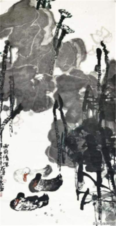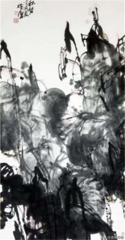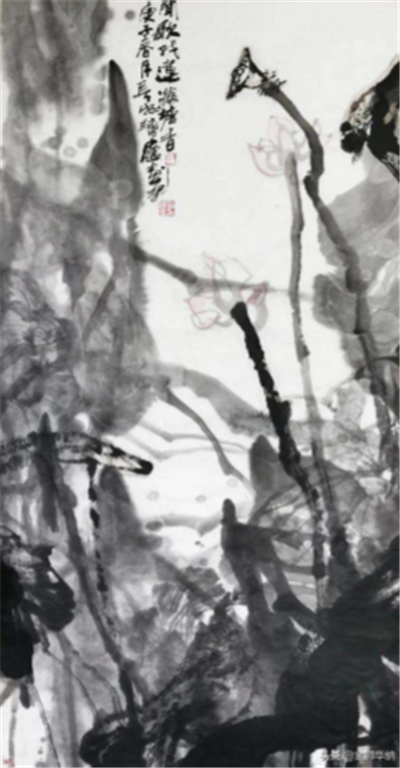 其中,《風(fēng)搖荷花聽(tīng)雨聲》這幅國(guó)畫作品令我記憶尤深,畫面尺寸為 180×96 厘米,整幅畫采用寫意手法,虛實(shí)相生,荷葉由近及遠(yuǎn),由實(shí)到虛,畫面色調(diào)以黑白為主,簡(jiǎn)約又包容萬(wàn)物,墨色濃淡有致,筆法干脆利落,含蓄中帶著一股蓄勢(shì)待發(fā)的張力,構(gòu)圖飽滿,幾片荷葉占據(jù)了畫面的主要部分,在荷葉群中不時(shí)穿插幾朵荷花、蓮藕,荷葉的輪廓從前至后,由清晰至模糊,營(yíng)造了一種水汽氤氳感,荷花隨風(fēng)擺動(dòng),遠(yuǎn)處的荷葉似乎和水面渾然融為一體的畫面,荷花與水色天光互為襯托,靈動(dòng)生機(jī),畫家將荷花人格化,以荷言志,贊賞荷花在雨中傲然挺立的高潔風(fēng)骨,憐惜荷花飽受風(fēng)雨的摧殘,以此為畫面精神支點(diǎn),物我合一,從自然界植物的角度感受世間百態(tài),看著這幅畫,仿佛置身煙雨迷離,以游人眼光靜靜觀賞荷花搖曳之姿,在水墨流動(dòng)中,體味傳統(tǒng)審美意象之氣脈,感受荷花的“出淤泥而不染,濯清漣而不妖”的淡泊雅致……
