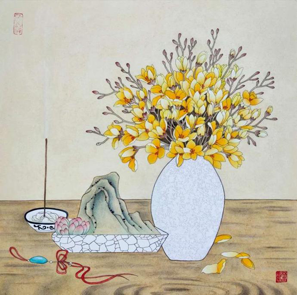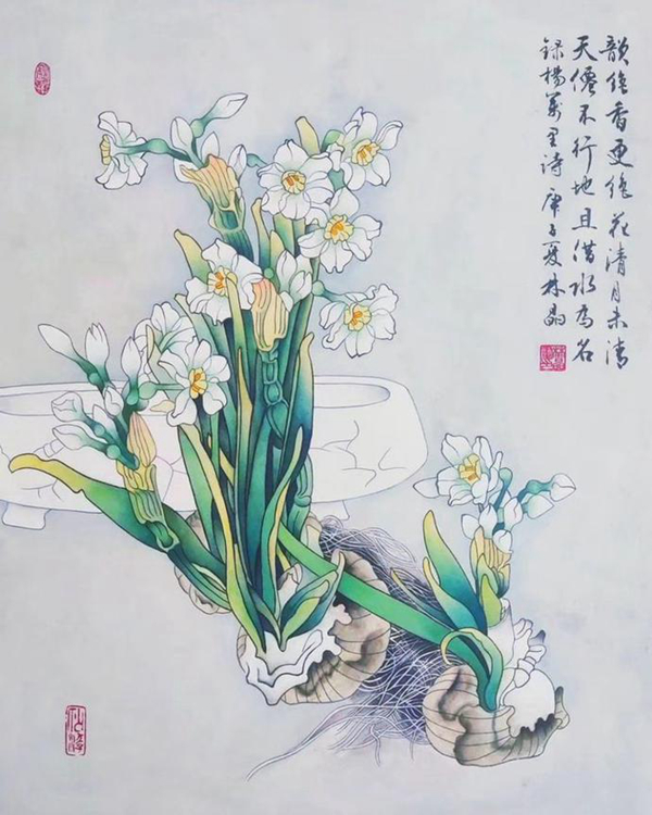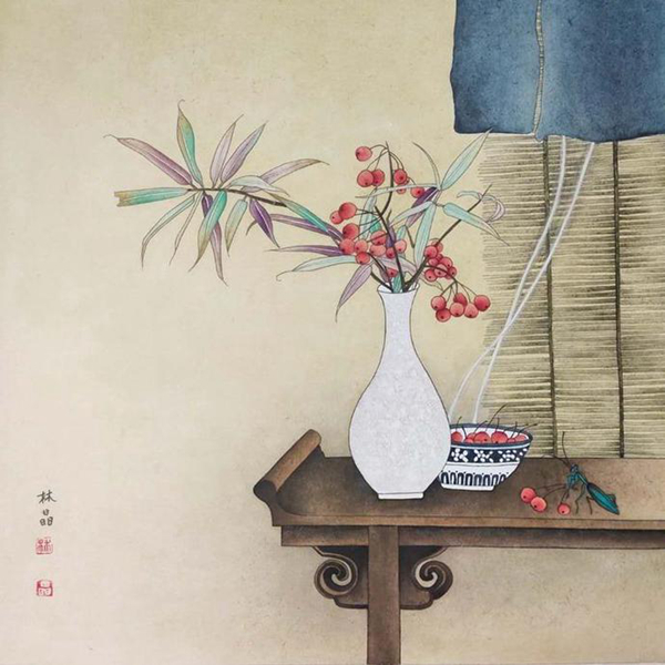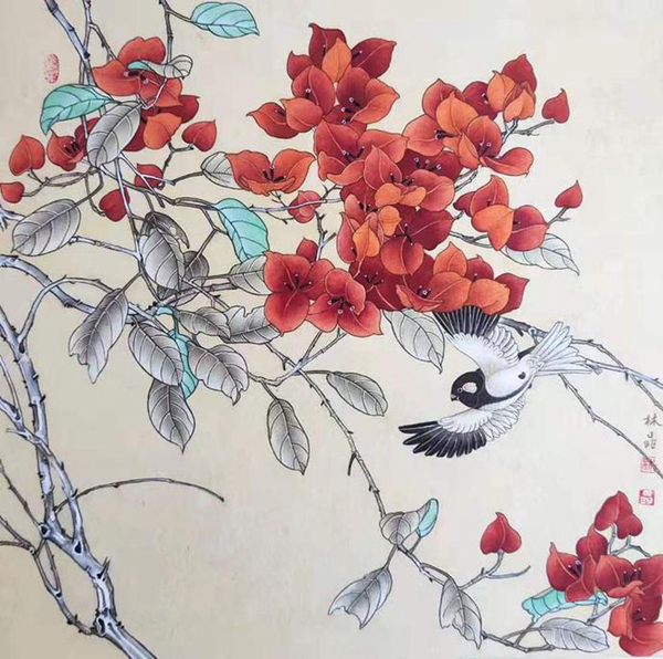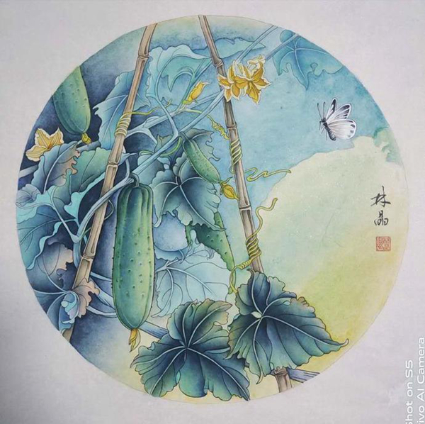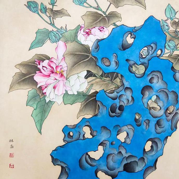 簡(jiǎn)而言之,林晶女畫家的工筆花鳥畫,無論在構(gòu)圖上、線條上、設(shè)色上都彰顯出自己的“功夫”。她的每一幅畫,都那樣艷而不俗、淡而有味,讓人有百看不厭的舒暢感。