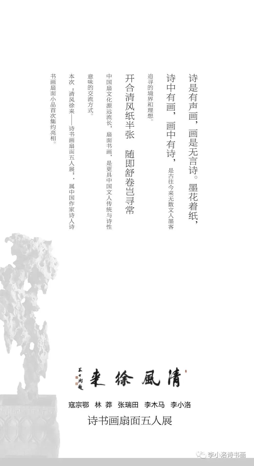 詩(shī)是有聲畫,畫是無言詩(shī)。墨花著紙,詩(shī)中有畫,畫中有詩(shī),是古往今來無數(shù)文人墨客追尋的境界和理想。中國(guó)扇文化源遠(yuǎn)流長(zhǎng),扇面書畫,是更具中國(guó)文人傳統(tǒng)與詩(shī)性意味的交流方式。本次“清風(fēng)徐來——詩(shī)書畫扇面五人展”,屬中國(guó)作家詩(shī)人詩(shī)書畫扇面小品首次集約亮相。